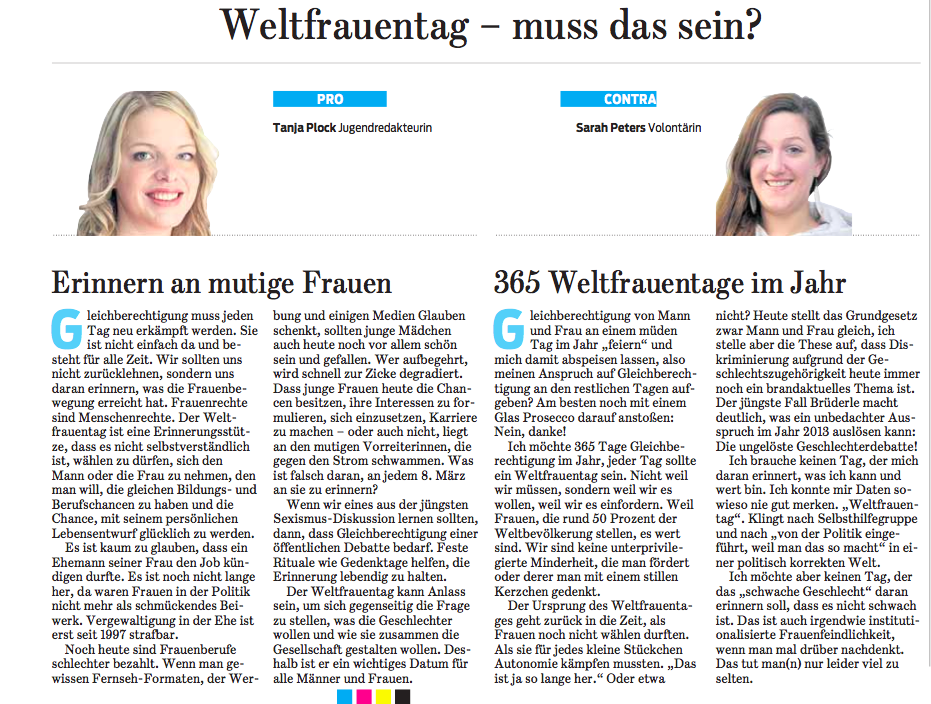 Am 8. März ist Weltfrauentag. Meine geschätzte Kollegin Tanja Plock und meine Wenigkeit haben uns Gedanken dazu gemacht. Brauchen wir den Weltfrauentag oder nicht? Zwei selbsternannte Emanzen kommen dabei auf keinen Nenner: